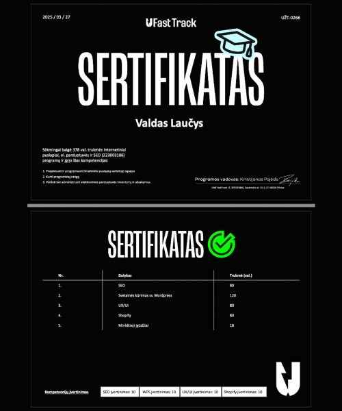 Po oficialių kursų baigimo su aukščiausiais įvertinimais (sertifikato nuoroda) iškart pradėti darbai su realiais, veikiančiais verslais. Kiekvienas projektas paremtas aiškia struktūra, orientuota į naudotojo patirtį, greitį, saugumą bei atsargines kopijas – tai nėra papildoma funkcija, o standartas. Visuose projektuose diegiami vidinio SEO sprendimai, užtikrinantys matomumą paieškos sistemose.